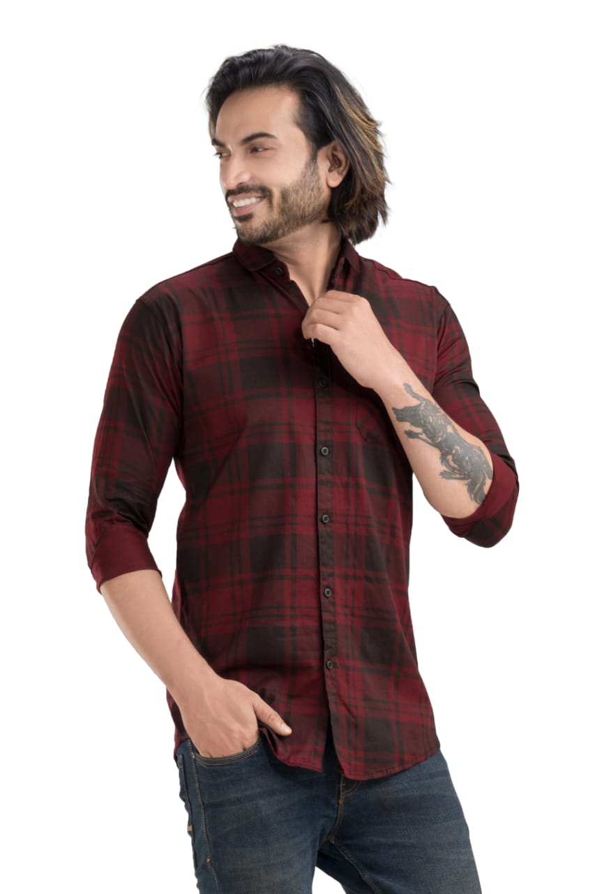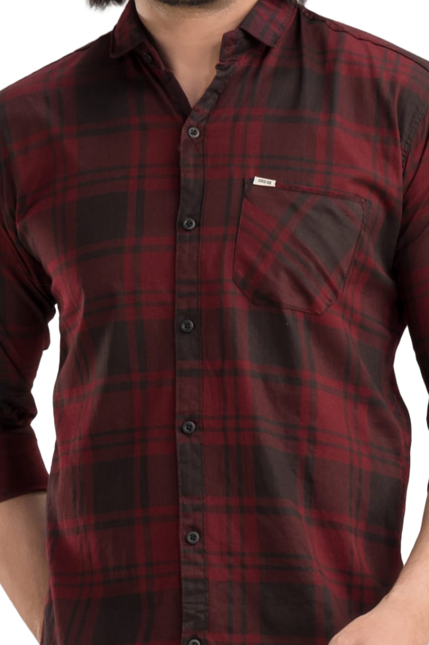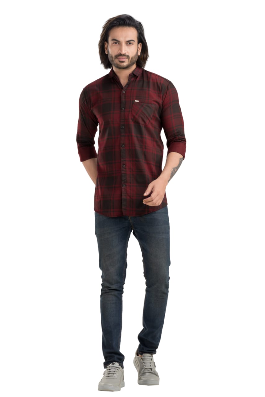 Baronial Bio Finish Twil Shirt (Maroon) Slim Fit has a spread collar, 1 patch pocket, long regular sleeves, straight hem